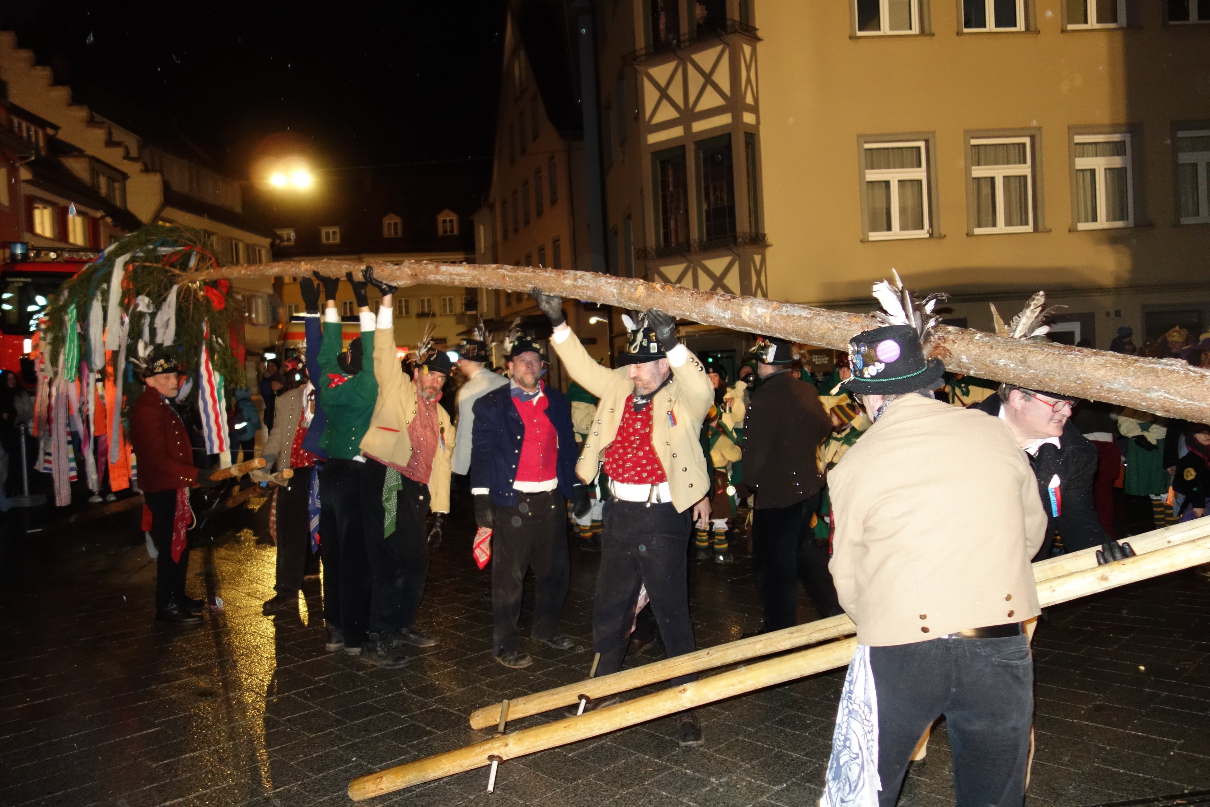 Die Räuber der Schwarzen Veri machten sich ans Werk und stellten unter der Anfeuerung aller Anwesenden den Narrenbaum. In Begleitung der Narren- und Bruderzunft Lindau durfte sich Zunftmeister Jürgen Breg den Stadtschlüssel von den Vertretern der Stadt Ravensburg "aneignen". Jedoch war der Zunftmeister der Ravensburger Schwarze Veri Zunft schneller: Er hatte sich mit seinem Vize Andreas Denda bereits im Voraus des Schlüssels der Stadtkasse bemächtigt und beide verteilten munter die erbeuteten (Schokoladen)Gulden unter die anwesenden Kinder.