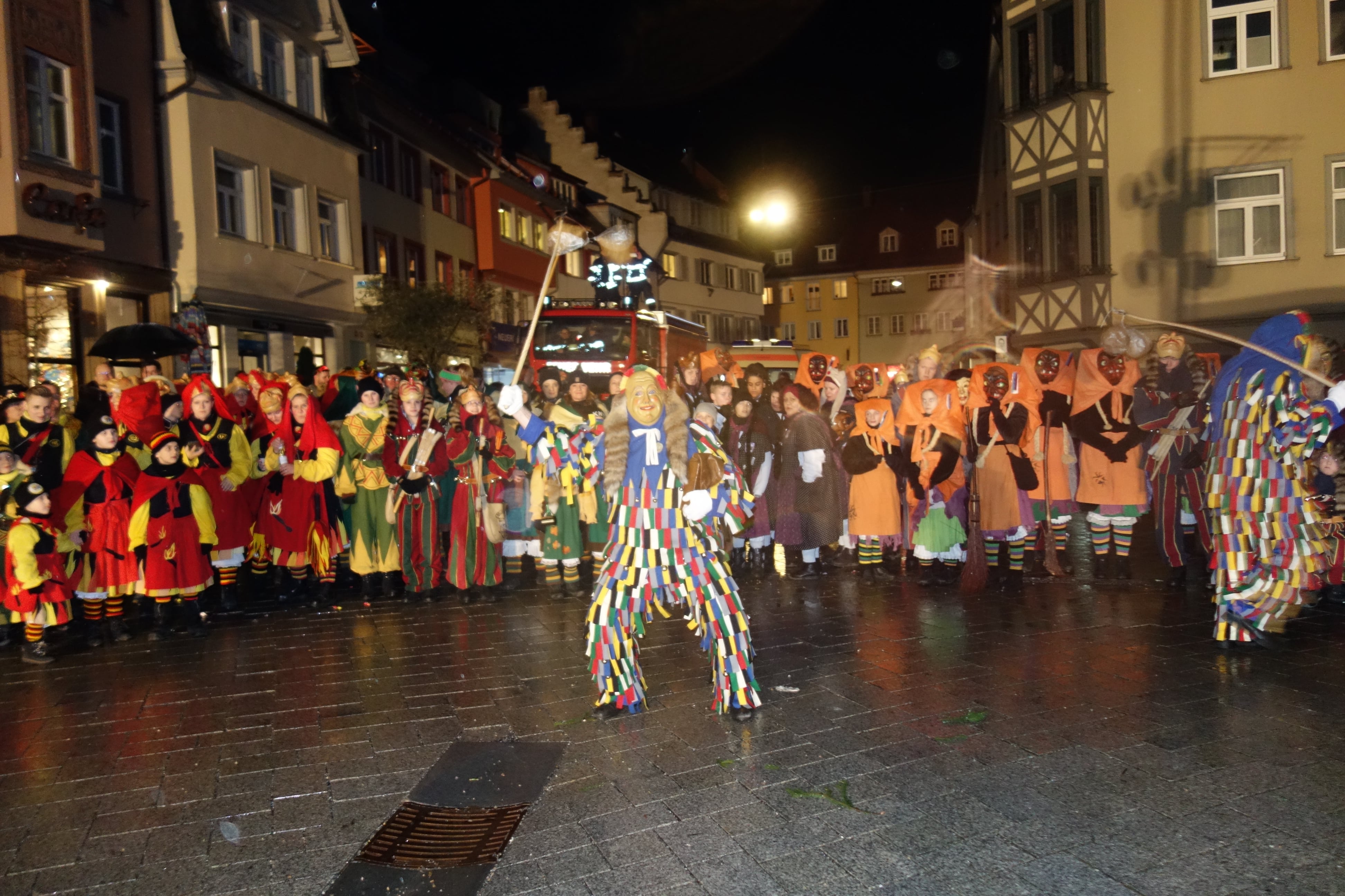 Im kleinen Festzug ging es vom Obertor auf den Gespinstmarkt, wo bereits zahlreiche Zuschauer (trotz Regens) auf die Narren warteten. Unterstützt wurde dieser Umzug von den Narrenzünften aus